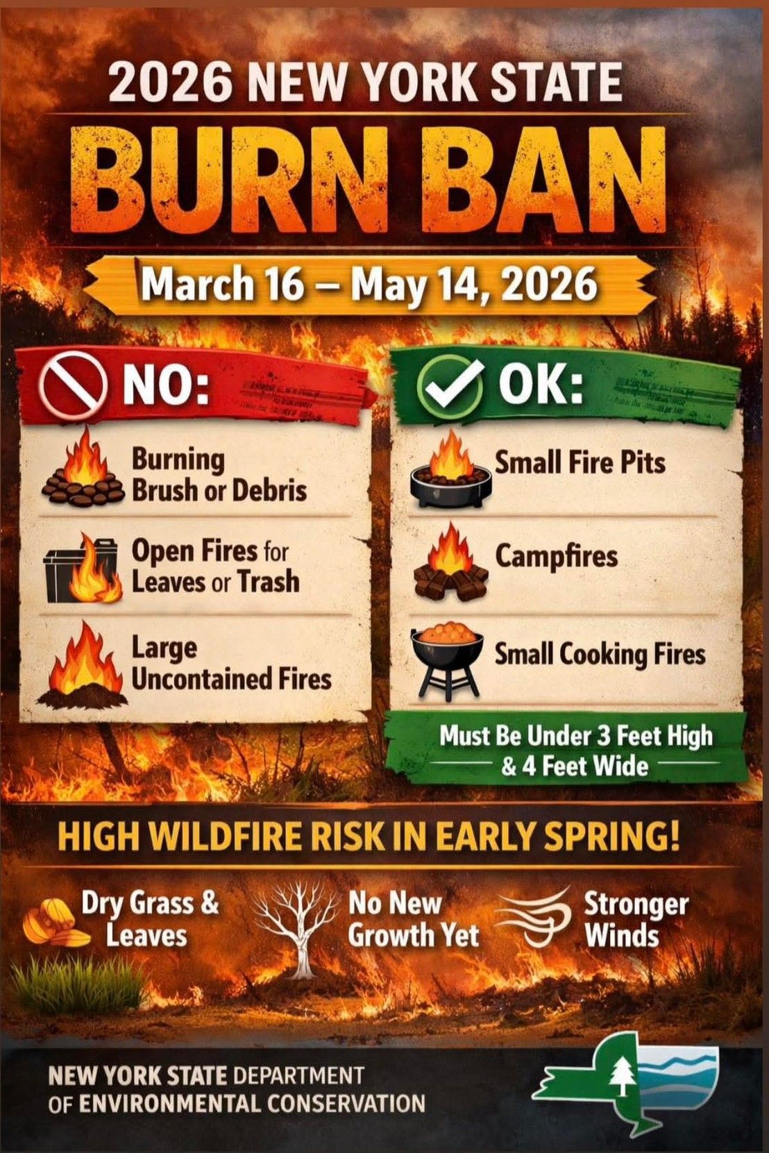 NYS DEC Annual Burn Ban will be in effect from March 16th until May 14th!!
